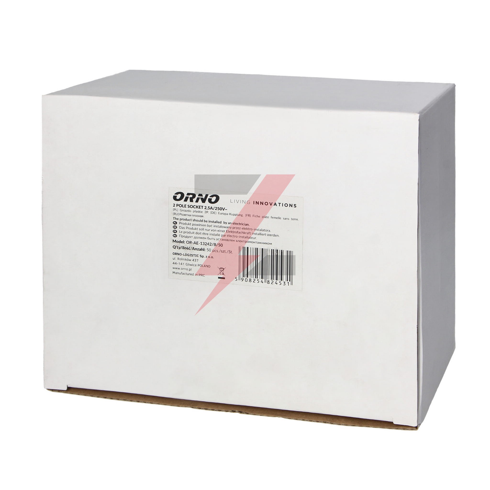 Gniazdo płaskie bez uziemienia, 2,5A, 250V, czarny poliwęglan, 50 sztuka OR-AE-13242/B/50