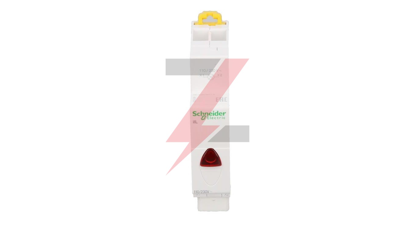 Lampka modułowa, o numerze A9E18320, pojedyncza, czerwona iIL-1-R-230, napięcie pracy 110-230 VAC, 110-130 VDC. Technologia LED, trwałość 100 000 godziny ciągłego świecenia Czerwone światło na przedniej ściance zapala się, wskazując obecność napięcia. Stopień ochrony to IP20. Stopień zanieczyszczenia wynosi 3. Szerokość w rozstawie 9 mm wynosi 2.