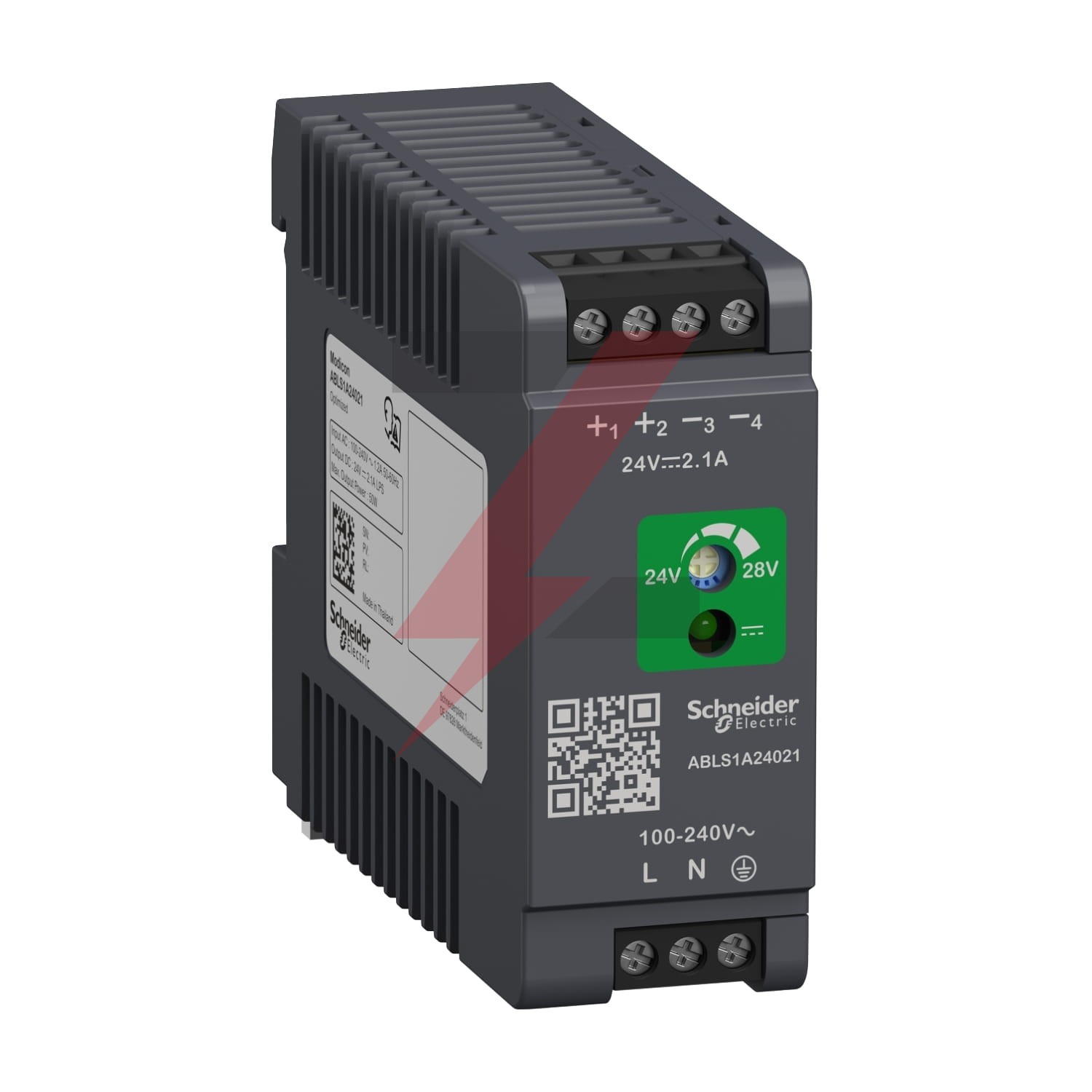 Ten produkt należy do gamy Modicon ABL, oferty zasilaczy do zastosowań przemysłowych. Jest to regulowany zasilacz impulsowy. Posiada znamionowe napięcie wejściowe od 100 V do 240 V AC, znamionowy prąd wyjściowy 2,1 A przy 24 V DC i znamionową moc wyjściową 50 W. Zasila obwody sterujące w automatyce przemysłowej. Zasilacz posiada zabezpieczenie przed przeciążeniem i zwarciem. Działa w zakresie od minus 25 stopni Celsjusza do plus 70 stopni Celsjusza i od 0 metrów do 2000 metrów lub 5000 metrów z obniżeniem wartości znamionowych. Mierzy 75 mm wysokości, 30 mm szerokości i 89,5 mm głębokości. Waży 0,180 kg. No62368-1/No61010-2-201/No61010-1 oraz posiada certyfikat CE, CUL listed/recognized, RCM, CBscheme. Jest to zasilacz do zastosowań przemysłowych Jest zgodny z certyfikatami CE, CB Scheme, cULus Listed, cURus Recognized, RCM, EAC, UKCA, KC oraz normami IEC/EN 62368-1, IEC/EN 61010-1/2, UL/CSA61010-1/2. Seria Acti9 iC60 miniaturowych wyłączników automatycznych jest zalecana do jego ochrony. Rodzaj ochrony to 6A, krzywa C lub 10A, krzywa B. Posiada z przodu diodę LED sygnalizującą obecność napięcia wyjściowego DC oraz kod QR umożliwiający dostęp do najnowszej dokumentacji technicznej. Montuje się go na szynie DIN 35 mm. Dostarcza energię do zautomatyzowanych systemów. Zaprojektowany z myślą o prostych maszynach i zastosowaniach.