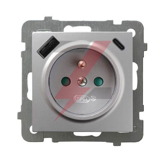 AS Gniazdo pojedyncze z uziemieniem z przesłonami torów prądowych, z ładowarką USB A+C srebro GP-1GZPUSBAC/m/18