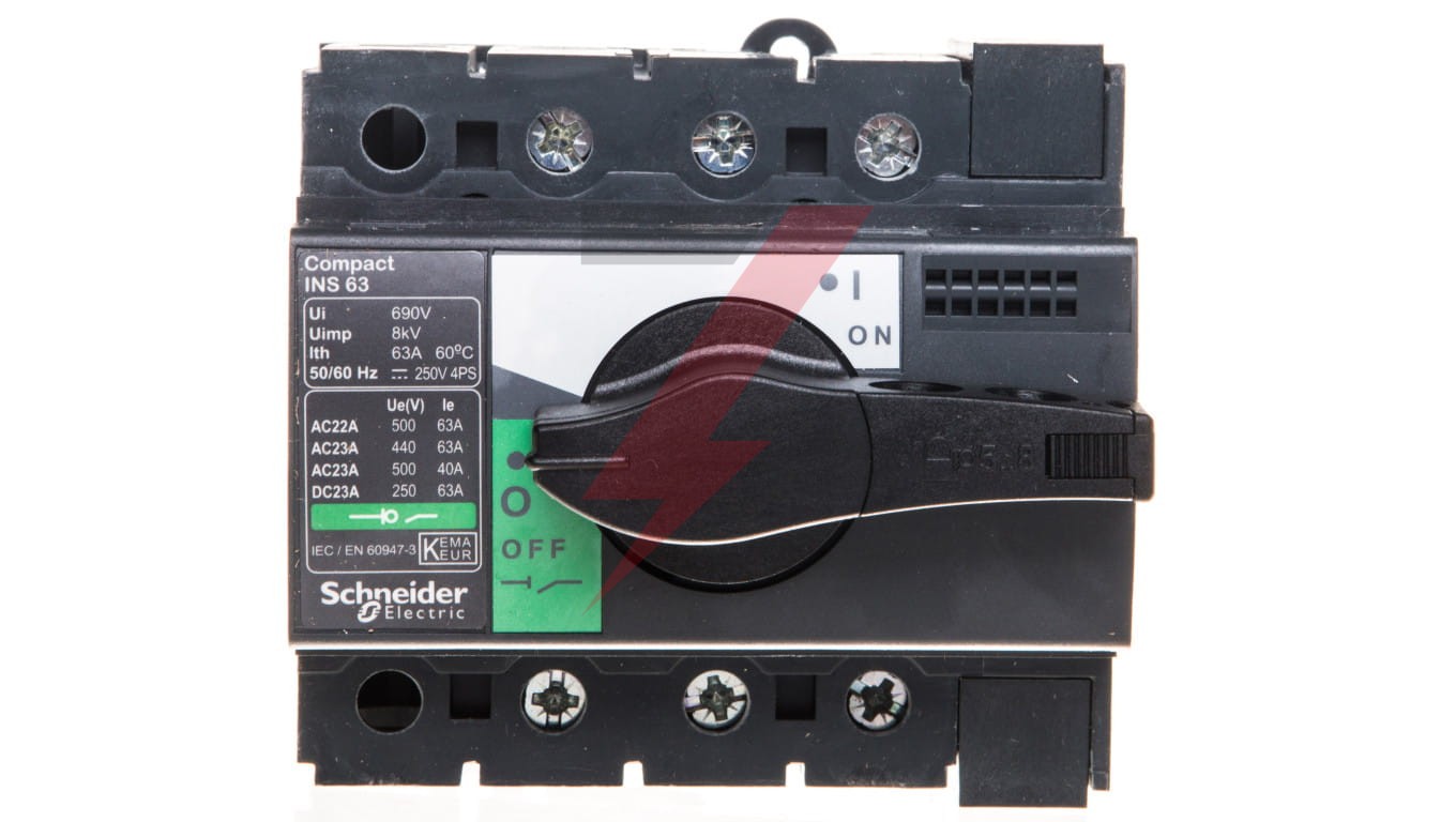 Kompaktowa INS63 to 3-polowy, nieautomatyczny rozłącznik z czarnym uchwytem obrotowym. Nadaje się do izolacji ze wskaźnikiem pozytywnego kontaktu, zgodnie z normami IEC 60947-1 i IEC60947-3. Prąd roboczy wynosi 63 A przy 415VAC w kategoriach AC22A i AC23A. Napięcie znamionowe wynosi 500VAC 50/60Hz lub 125VDC. Czarny uchwyt obrotowy został zaprojektowany tak, aby zapewnić łatwą obsługę i wysoką wydajność przy przerwie prądowej. Compact INS63 to przednie urządzenie poziomu izolacji klasy II zgodne z normą IEC 60664.