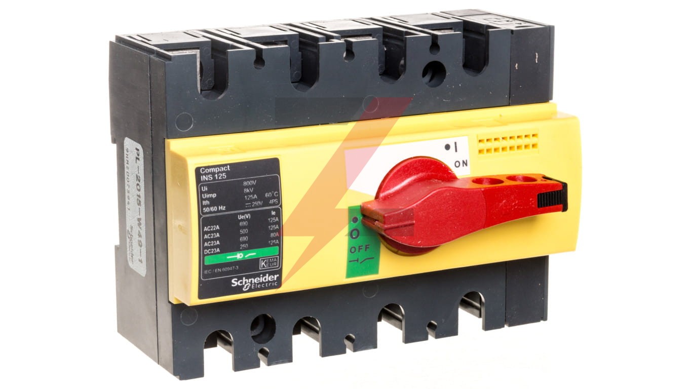 Ten kompaktowy INS125 to 4-biegunowy, nieautomatyczny rozłącznik z czerwonym uchwytem obrotowym i żółtym przodem. Nadaje się do izolacji ze wskaźnikiem pozytywnego kontaktu, zgodnie z normami IEC 60947-1 i IEC60947-3. Prąd roboczy wynosi 125 A przy 415VAC w kategoriach AC22A i AC23A. Napięcie znamionowe wynosi 690VAC 50/60Hz lub 250VDC. Może być używany jako urządzenie awaryjnego wyłączania. Dla łatwej identyfikacji wykorzystuje specjalne kolory określone przez normy. Czerwony uchwyt obrotowy został zaprojektowany tak, aby zapewnić łatwą obsługę i wysoką wydajność podczas przerywania prądów. Compact INS125 to przednie urządzenie poziomu izolacji klasy II zgodne z normą IEC 60664.
