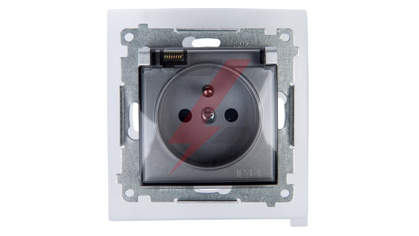 Simon 54 Gniazdo bryzgoszczelne z/u IP44 z przesłoną torów i klapką transparentną srebrny mat DGZ1BZ.01/43A