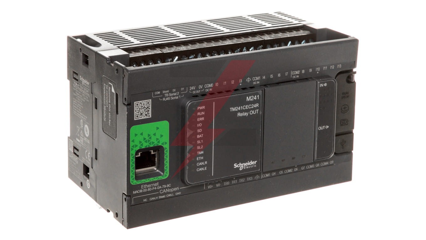 Ten produkt należy do rodziny sterowników logicznych Modicon M241, które można stosować w wymagających aplikacjachTen sterownik logiczny zapewnia 14 dyskretnych, 8 szybkich wejść, 6 przekaźników, 4 tranzystory, 4 szybkie wyjścia z tranzystorem, wyjście przekaźnika głównego Ethernet CANPosiada znamionowe napięcie zasilania od 100 V do 240 V AC, napięcie wyjściowe od 5 V do 125 V DC lub od 5 V do 250 V AC dla przekaźnika, 24 V DC dla tranzystora i prąd wyjściowy 2 A dla przekaźnika, 0,1 A dla szybkiego wyjścia, 0,5 A dla tranzystoraTen produkt umożliwia tworzenie aplikacji w sposób intuicyjny, jak nigdy dotąd, dzięki zorganizowanemu projektowi ekranuZintegrowane połączenia to port USB z złączem mini B USB 2.0, nieizolowane łącze szeregowe 1 ze złączem RJ45 i interfejsem RS232/RS485 oraz nieizolowane łącze szeregowe 2 ze zdejmowanym złączem bloku zacisków śrubowych i interfejsem RS485Jest to sterownik Modicon M241 z 8 MB dla programu, 64 MB dla pamięci systemowej RAM, 128MB wbudowana pamięć flash do tworzenia kopii zapasowych programów użytkownika oraz pojemność pamięci karty SD 16 GB. Jest to produkt o klasyfikacji IP20Jego wymiary to 150 mm (szerokość) x 95 mm (głębokość) x 90 mm (wysokość). Waży 0.53 kg. Sterowniki logiczne Modicon M241 są przeznaczone do wysokowydajnych maszyn kompaktowych z funkcjami sterowania prędkością i położeniemTen produkt posiada certyfikat CE, IACS E10, RCM, CSA, CULus. Spełnia wymagania norm ANSI/ISA 12-12-01, CSA C22.2 No 142, CSA C22.2 No 213, EN/IEC 61131-22007, specyfikacji morskiej (LR, ABS, DNV, GL), UL 1604 i UL 508. Obsługuje montaż na szynie DINOsiągnij wzorcową wydajność, zwiększając rentowność dzięki Modicon M241 dzięki intuicyjnemu programowaniu maszyny z Ecostruxure machine Expert, gotowymi aplikacjami i blokami funkcyjnymi.