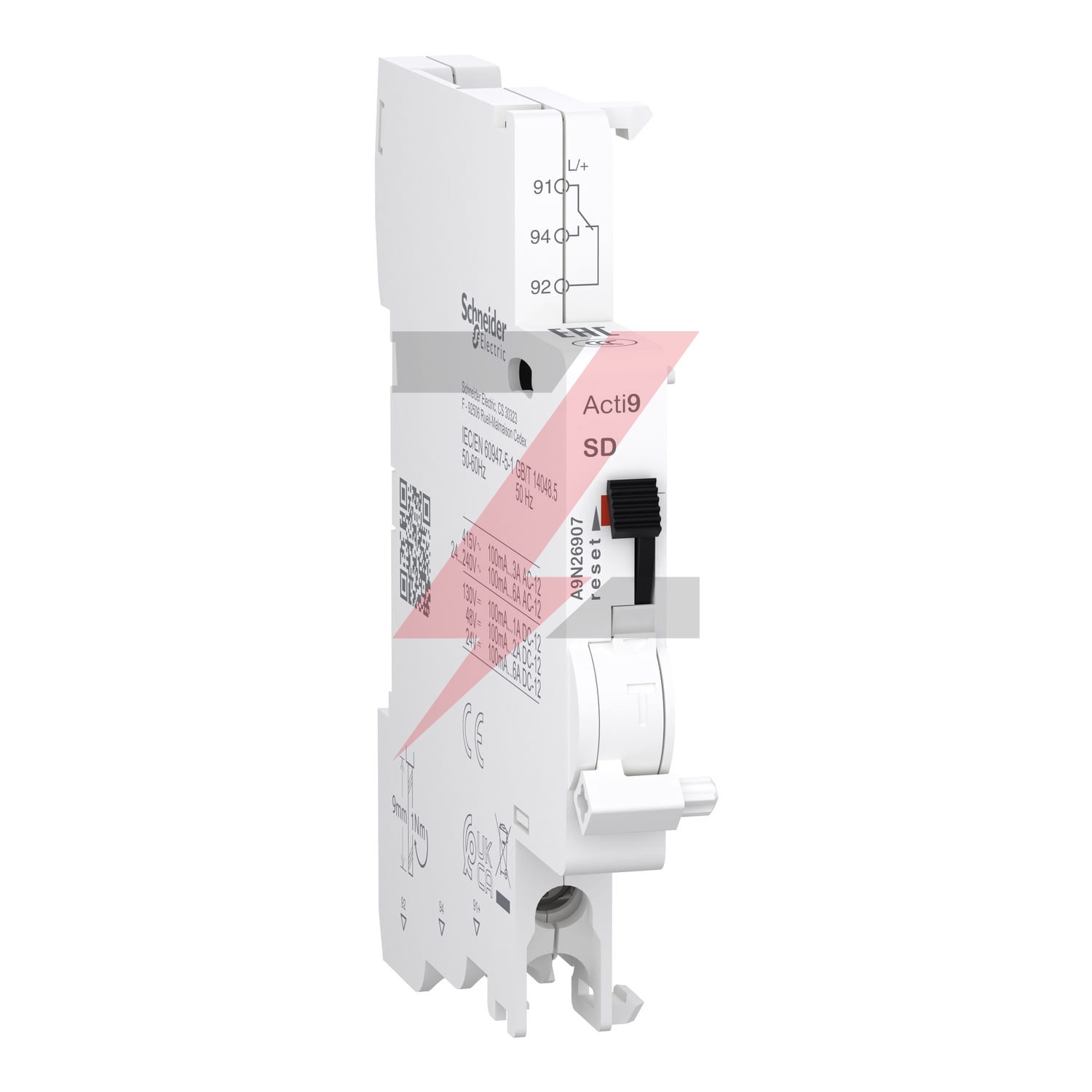 Jest to modułowy styk sygnalizacyjny iSD Acti9 używany jako zdalny wskaźnik wyzwolenia w przypadku usterki powiązanego urządzenia. W sieci AC prąd znamionowy (ln) wynosi 6A przy 24VAC do 240VAC i 3A przy 415VAC przy częstotliwości roboczej od 50Hz do 60Hz. W sieci DC prąd znamionowy (ln) wynosi 6A przy 24VDC, 2A przy 48VDC, 1.5A przy 60VDC i 1A przy 130VDC. Posiada 1 pozycyjny wyłącznik ze stykami typu 1 C/O. Przeznaczony jest do nowych lub remontowanych instalacji w małych obiektach komercyjnych i budynkach. Przeznaczony jest do nowych lub remontowanych instalacji w małych obiektach komercyjnych i budynkach. SD jest używany jako skrócona nazwa urządzenia lub kod zgodności. Wskaźnik mechaniczny znajduje się w produkcie do sygnalizacji lokalnej. Ma złącze zacisku śrubowego na górze. Połączenie pozwala na podłączenie sztywnego druta miedzianego. Zakres przekroju wynosi od 0,5mm² do 2,5mm². Ma złącze zacisku śrubowego na dole. Połączenie umożliwia podłączenie 2 elastycznych kabli miedzianych o przekroju 1,5mm². Ma złącze zacisku śrubowego na dole. Połączenie umożliwia podłączenie 2 elastycznych kabli miedzianych z tuleją o przekroju 1,5mm². Napięcie znamionowe izolacji Ui wynosi do 500V. Napięcie znamionowe wytrzymywane Uimp wynosi 4kV. Może być montowany na szynie DIN w celu instalacji modułowej. Szerokość wynosi 9mm. Wymiary to: (szer.) 9mm x (wys.) 85,3 mm x (gł.) 68 mm. Kolor: biały. Waga produktu wynosi 30g. Stopień zanieczyszczenia wynosi 3. Poziom tropikalizacji to 2. Długość odizolowywania drutu wynosi 9 mm. Moment dokręcania połączenia wynosi 1N.m (dół) dla wkrętaka PZ1. Stopień ochrony IP: IP20. Temperatura pracy wynosi od -25°C do +70°C. Temperatura przechowywania wynosi od -40°C do +85°C. Ten produkt jest zgodny z normami EN/IEC 60947-5-1 i GB/T 14048.5. Posiada znaki jakości EAC i CCC oraz posiada certyfikaty CE i UKCA.