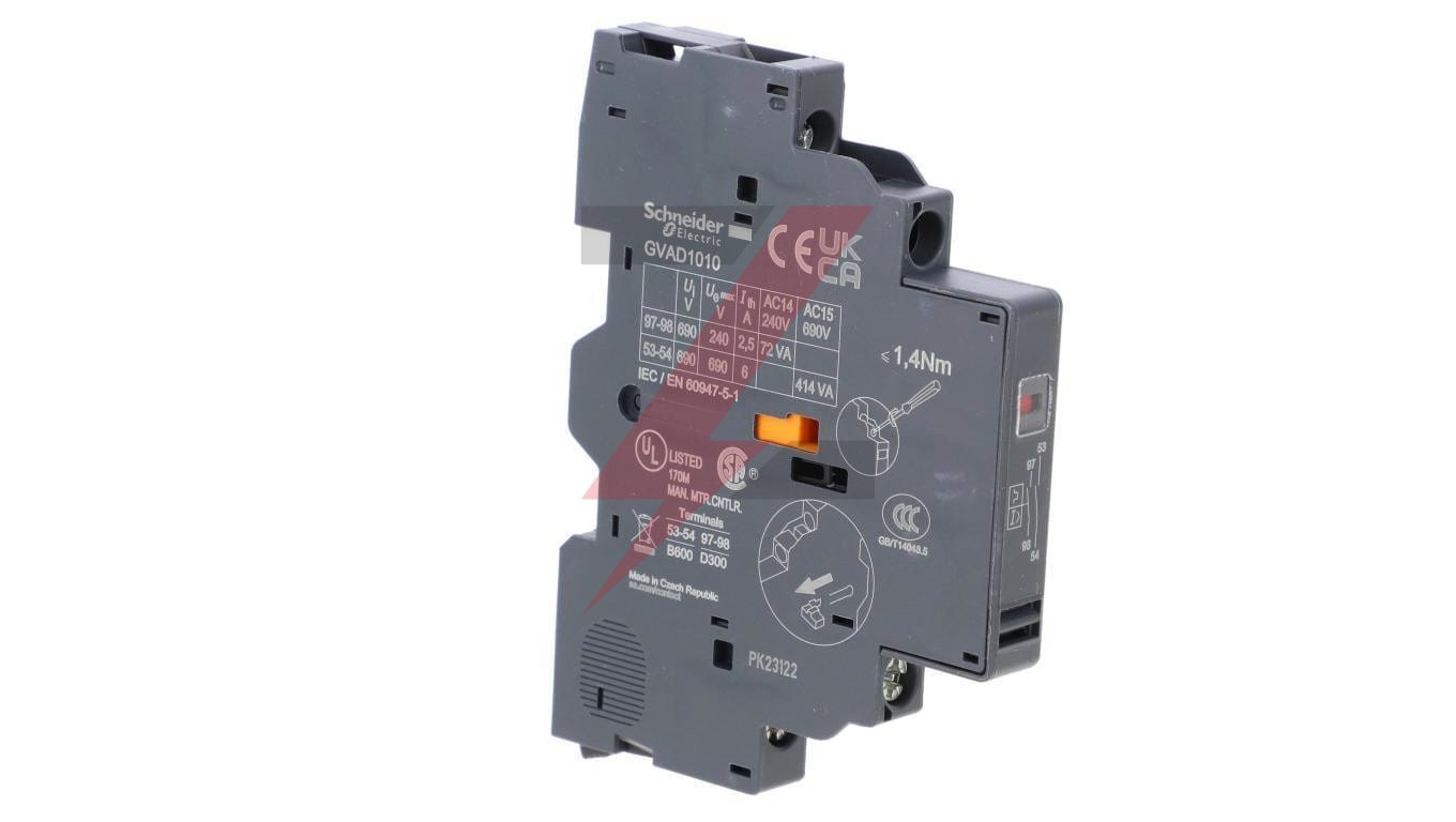 Blok styków pomocniczych TeSys GV do wyłączników silnikowych GV2 i GV3Styk sygnalizacyjny 1NO + 1NO natychmiastowy styk pomocniczyChwilowy styk pomocniczy przystosowany do pracy pod napięciem do 6 A/690 V AC i 6 A/240 V DCStyk sygnalizacji usterek przystosowany do pracy w konfiguracji AC do 2 A/240 V oraz DC do 1 A/60 VDo zainstalowania po lewej stronie wyłącznika automatycznego (maks. montaż 1 bloku), podłączenie za pomocą zacisków śrubowych. Posiada certyfikaty zgodności z wieloma normami (IEC, UL, CSA, CCC, EAC) i Green Premium (RoHS/REACh).