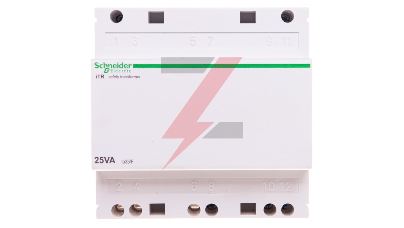 Transformator bezpieczeństwa Acti9 iTR 25 VA umożliwia uzyskanie 12VAC lub 24VAC bardzo niskiego napięcia z 230VAC sieciTransformator jest bezpieczny, obwody pierwotne i wtórne są doskonale zaizolowaneZasilanie wynosi 25 VA. Częstotliwość robocza to 50 Hz lub 60 HzNapięcie pierwotne wynosi 230VAC +/-10%. Napięcie wyjściowe wtórne wynosi od 12VAC do 24VACJest odporny na prądy zwarciowe dzięki wbudowanemu urządzeniuDla 12VAC znamionowego napięcia wtórnego napięcie wyłączenia obciążenia jest 14VACDla 24VAC znamionowego napięcia wtórnego napięcie wyłączenia obciążenia jest 28VACJest to urządzenie klasy II z osłoną zacisku (opcjonalne)Transformator bezpieczeństwa powinien być montowany wyłącznie w pozycji pionowejSzerokość w boisku 9 mm wynosi 10. Waga wynosi 1309gStopień ochrony według normy IEC 60529 to IP20 z osłoną zaciskuWymiary: (sz.) 90 mm x (wys.) 89 mm x (gł.) 60 mm. Szerokość w modułach 18 mm wynosi 5. Temperatura pracy wynosi od -20°C do + 55°C. Temperatura przechowywania wynosi od -25°C do + 80°CTen produkt jest zgodny z normą IEC/EN 61558-2-6.