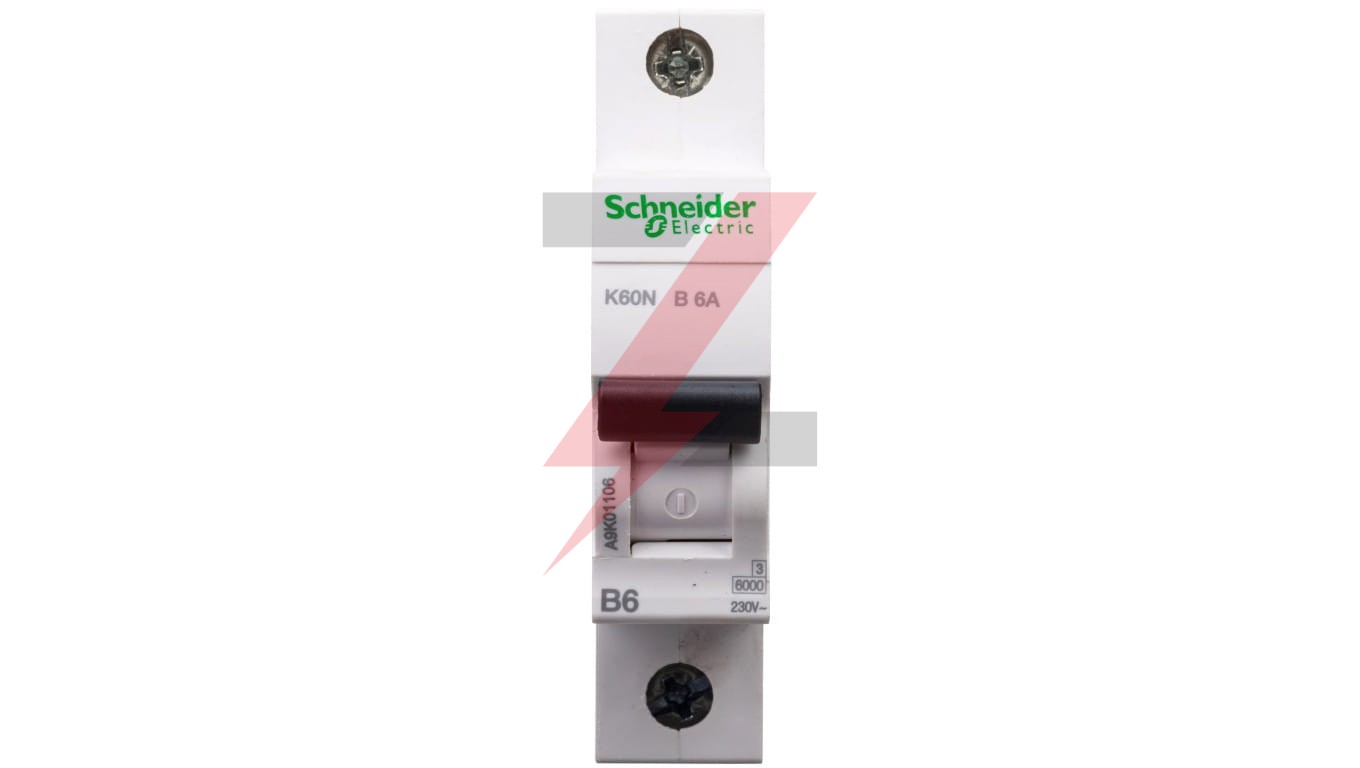Wyłącznik nadprądowy serii K60N, o numerze A9K01106, K60N-B6-1, 1-biegunowy (jednobiegunowy), 6A, charakterystyka B, wytrzymałość zwarciowa 6kA, zapew nia ochronę przed zwarciami i przeciążeniami. enterWyłącznik nadprądowy dopasowany do potrzeb budownictwa mieszkaniowego i podobnego. Podwójne zaciski od dołu (szyna + przewód). Karbowane zaciski zwiększające pewność podłączenia. Styk migowy - szybkość zamykania styków nie zależy od szybkości manewrowania dźwignią aparatu.