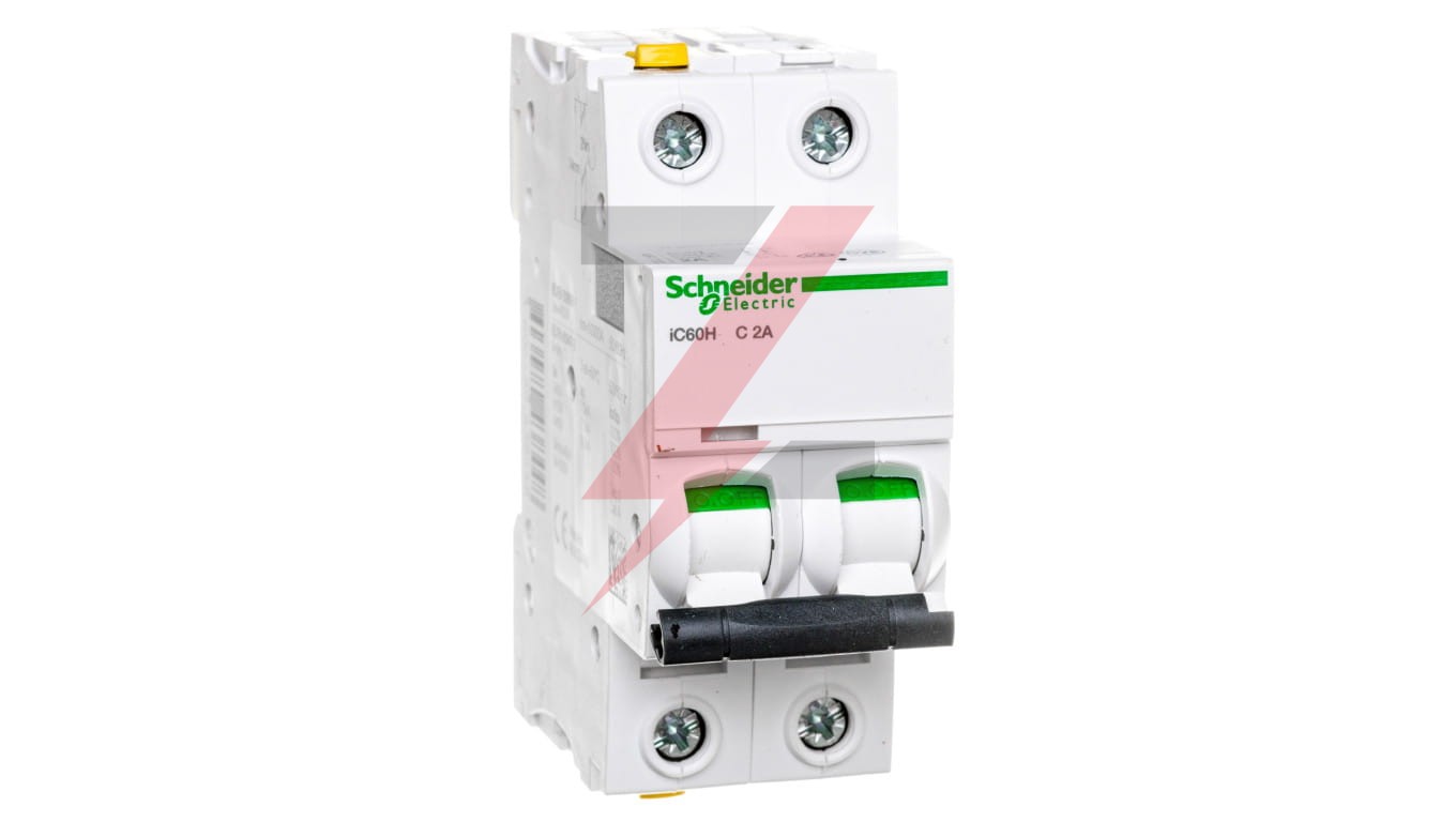 Wyłącznik nadprądowy serii iC60N, o numerze A9F07202, iC60H-C2-2, 2-biegunowy (dwubiegunowy), 2A, charakterystyka C, wytrzymałość zwarciowa 10kA, zape wnia ochronę przed zwarciami i przeciążeniami. enterMożliwość bezpośredniego podłączenia dwóch przewodów o różnych przekrojach. Optyczny wskaźnik Visi-Trip wyzwoleni a elektrycznego, biało-czerwony. Możliwość demontażu pojedynczego aparatu bez potrzeby zdejmowania szyny łączeniowej. Zdjemowanie z szyny DIN bez użycia narzędzi. Jego klasa ograniczenia 3 (zgodnie z normą EN/IEC60898-1) poprawia koszt ochrony obwodu odpływowego. Unikalny wskaźnik Visitrip skraca czas interwencji, pokazując uszkodzony obwód.