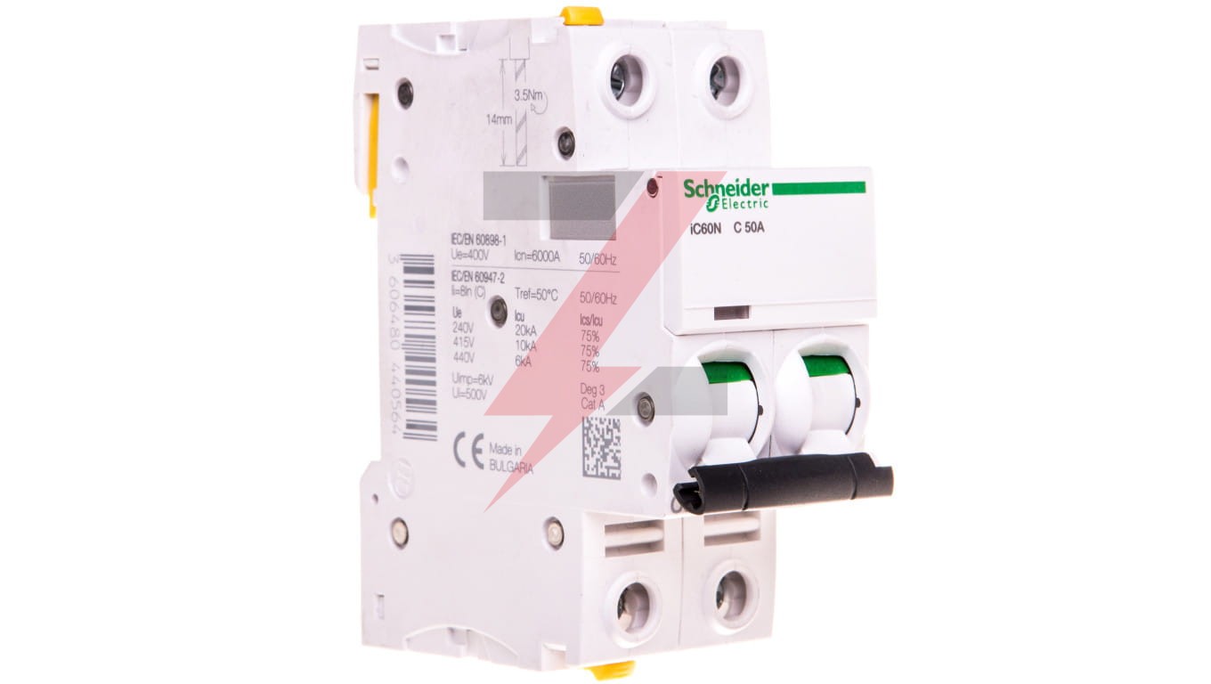 Wyłącznik nadprądowy iC60N-C50-2 C 50A 2-biegunowy ,o numerze A9F04250. Możliwość bezpośredniego podłączenia dwóch przewodów o różnych przekrojach. O ptyczny wskaźnik Visi-Trip wyzwolenia elektrycznego, biało-czerwony. Możliwość demontażu pojedynczego aparatu bez potrzeby zdejmowania szyny łączeniowej. Zdjemowanie z szyny DIN bez użycia narzędzi. Jego klasa ograniczenia 3 (zgodnie z normą EN/IEC60898-1) poprawia koszt ochrony obwodu odpływowego. Unikalny wskaźnik Visitrip skraca czas interwencji, pokazując uszkodzony obwód.