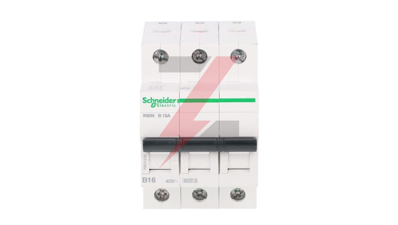 Wyłącznik nadprądowy serii K60N, o numerze A9K01316, K60N-B16-3, 3-biegunowy (trójbiegunowy), 16A, charakterystyka B, wytrzymałość zwarciowa 6kA, zape wnia ochronę przed zwarciami i przeciążeniami. enterWyłącznik nadprądowy dopasowany do potrzeb budownictwa mieszkaniowego i podobnego. Podwójne zaciski od dołu (szyn a + przewód). Karbowane zaciski zwiększające pewność podłączenia. Styk migowy - szybkość zamykania styków nie zależy od szybkości manewrowania dźwignią aparatu.