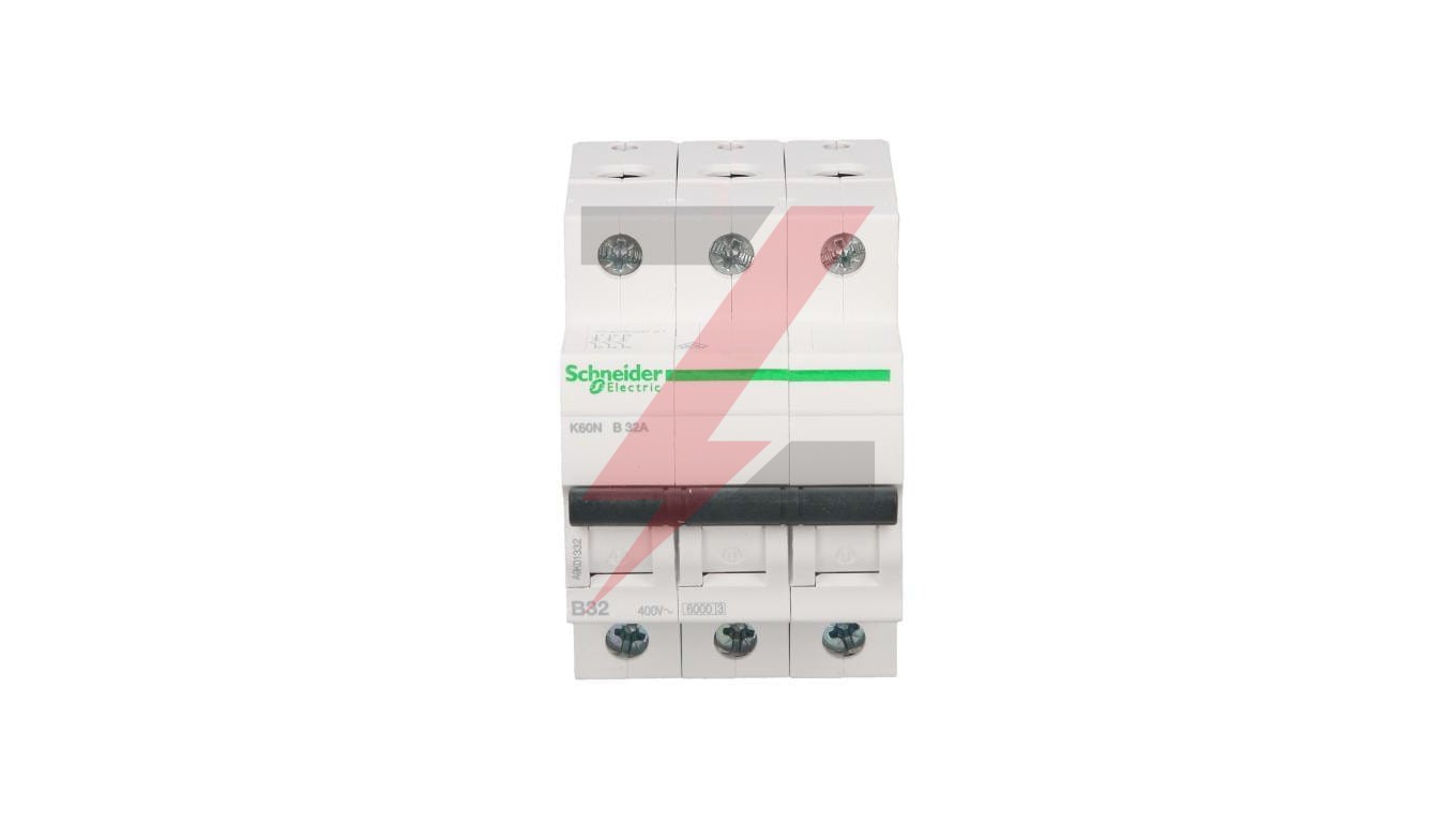Wyłącznik nadprądowy serii K60N, o numerze A9K01332, K60N-B32-3, 3-biegunowy (trójbiegunowy), 32A, charakterystyka B, wytrzymałość zwarciowa 6kA, zape wnia ochronę przed zwarciami i przeciążeniami. enterWyłącznik nadprądowy dopasowany do potrzeb budownictwa mieszkaniowego i podobnego. Podwójne zaciski od dołu (szyn a + przewód). Karbowane zaciski zwiększające pewność podłączenia. Styk migowy - szybkość zamykania styków nie zależy od szybkości manewrowania dźwignią aparatu.