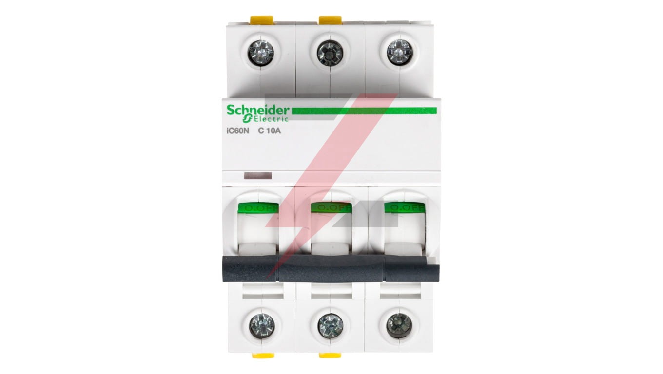 Wyłącznik nadprądowy serii iC60N, o numerze A9F04310, iC60N-C10-3, 3-biegunowy (trójbiegunowy), 10A, charakterystyka C, wytrzymałość zwarciowa 6kA, za pewnia ochronę przed zwarciami i przeciążeniami. enterMożliwość bezpośredniego podłączenia dwóch przewodów o różnych przekrojach. Optyczny wskaźnik Visi-Trip wyzwole nia elektrycznego, biało-czerwony. Możliwość demontażu pojedynczego aparatu bez potrzeby zdejmowania szyny łączeniowej. Zdjemowanie z szyny DIN bez użycia narzędzi. Jego klasa ograniczenia 3 (zgodnie z normą EN/IEC60898-1) poprawia koszt ochrony obwodu odpływowego. Unikalny wskaźnik Visitrip skraca czas interwencji, pokazując uszkodzony obwód.