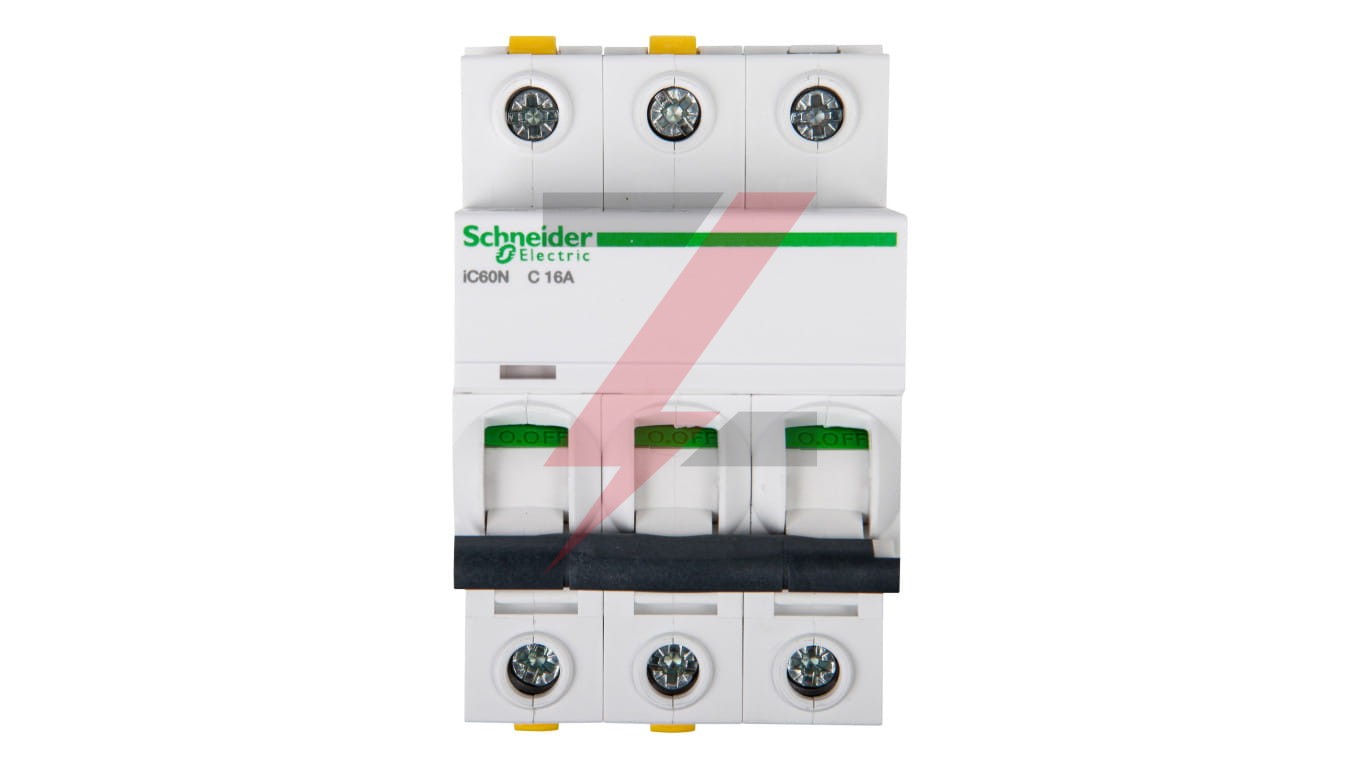 Wyłącznik nadprądowy serii iC60N, o numerze A9F04316, iC60N-C16-3, 3-biegunowy (trójbiegunowy), 16A, charakterystyka C, wytrzymałość zwarciowa 6kA, za pewnia ochronę przed zwarciami i przeciążeniami. enterMożliwość bezpośredniego podłączenia dwóch przewodów o różnych przekrojach. Optyczny wskaźnik Visi-Trip wyzwole nia elektrycznego, biało-czerwony. Możliwość demontażu pojedynczego aparatu bez potrzeby zdejmowania szyny łączeniowej. Zdjemowanie z szyny DIN bez użycia narzędzi. Jego klasa ograniczenia 3 (zgodnie z normą EN/IEC60898-1) poprawia koszt ochrony obwodu odpływowego. Unikalny wskaźnik Visitrip skraca czas interwencji, pokazując uszkodzony obwód.
