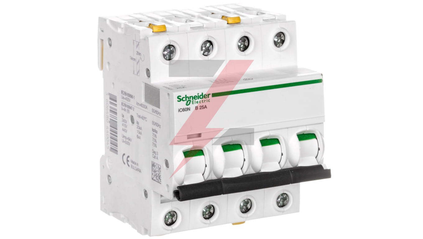 Wyłącznik nadprądowy iC60N-B25-4 B 25A 4-biegunowy ,o numerze A9F03425. Możliwość bezpośredniego podłączenia dwóch przewodów o różnych przekrojach. O ptyczny wskaźnik Visi-Trip wyzwolenia elektrycznego, biało-czerwony. Możliwość demontażu pojedynczego aparatu bez potrzeby zdejmowania szyny łączeniowej. Zdjemowanie z szyny DIN bez użycia narzędzi. Jego klasa ograniczenia 3 (zgodnie z normą EN/IEC60898-1) poprawia koszt ochrony obwodu odpływowego. Unikalny wskaźnik Visitrip skraca czas interwencji, pokazując uszkodzony obwód.