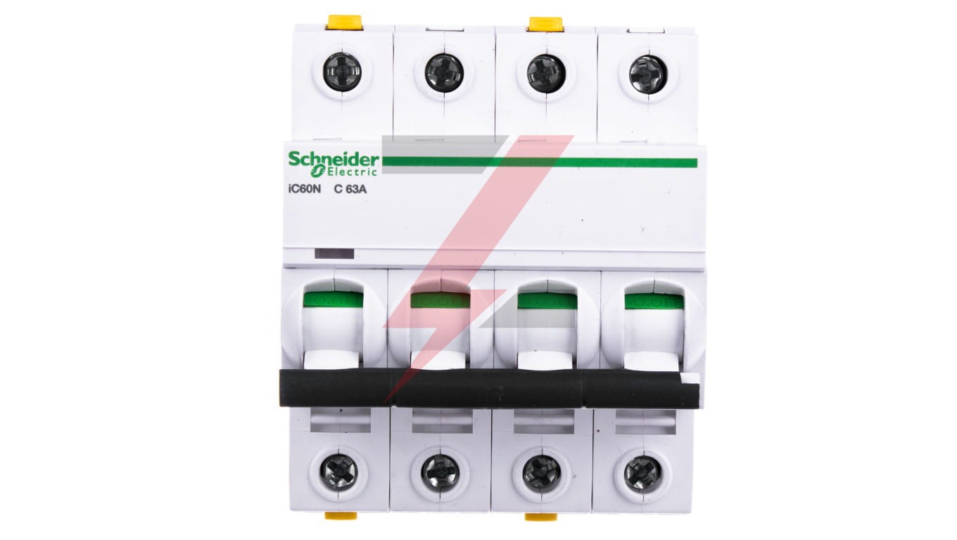 Wyłącznik nadprądowy iC60N-C63-4 C 63A 4-biegunowy ,o numerze A9F04463. Możliwość bezpośredniego podłączenia dwóch przewodów o różnych przekrojach. O ptyczny wskaźnik Visi-Trip wyzwolenia elektrycznego, biało-czerwony. Możliwość demontażu pojedynczego aparatu bez potrzeby zdejmowania szyny łączeniowej. Zdjemowanie z szyny DIN bez użycia narzędzi. Jego klasa ograniczenia 3 (zgodnie z normą EN/IEC60898-1) poprawia koszt ochrony obwodu odpływowego. Unikalny wskaźnik Visitrip skraca czas interwencji, pokazując uszkodzony obwód.