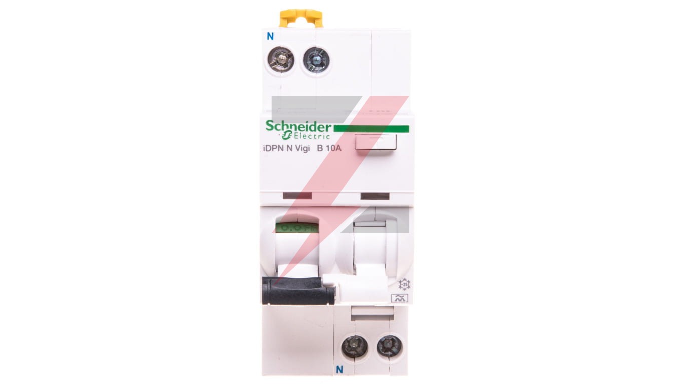 Wyłącznik kombinowany iDPNNVigi-B10-30-A B 10A 1N-biegunowy 30 mA typ A ,o numerze A9D56610. Dwuczłonowa dźwignia informuje, który z członów wyłączni ka wyzwolił. Optyczny wskaźnik Visi-Trip wyzwolenia elektrycznego, biało-czerwony oraz wskaźnik Visi-Safe -zielony wskaźnik potwierdzający otwarcie styków wyłącznika . Możliwość sprawdzania poprawności działania przyciskiem kontrolnym T jedynie raz do roku, przez pierwsze 7 lat użytkowania.