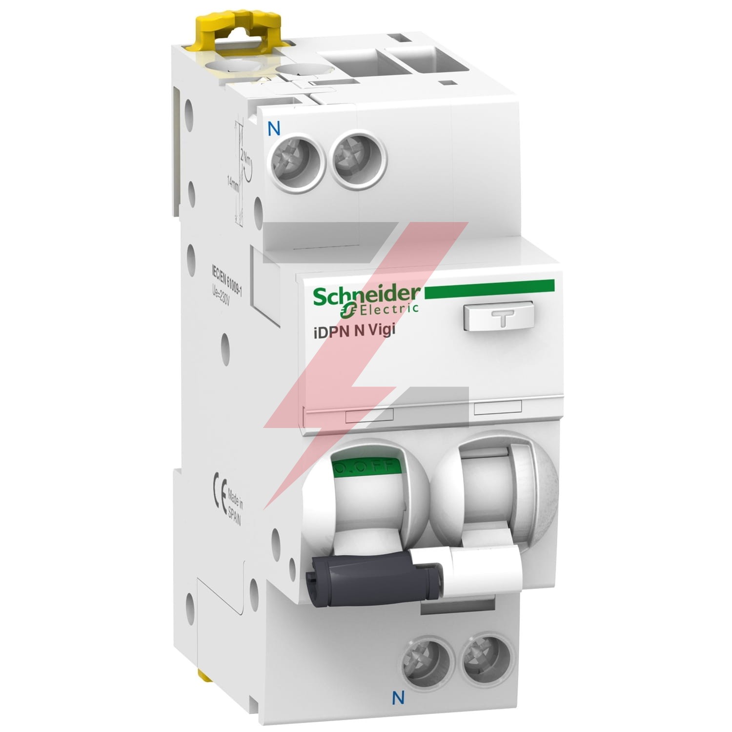 Wyłącznik kombinowany iDPNNVigi-C32-300-A C 32A 1N-biegunowy 300 mA typ A ,o numerze A9D42632. Dwuczłonowa dźwignia informuje, który z członów wyłącz nika wyzwolił. Optyczny wskaźnik Visi-Trip wyzwolenia elektrycznego, biało-czerwony oraz wskaźnik Visi-Safe -zielony wskaźnik potwierdzający otwarcie styków wyłączni ka. Możliwość sprawdzania poprawności działania przyciskiem kontrolnym T jedynie raz do roku, przez pierwsze 7 lat użytkowania.