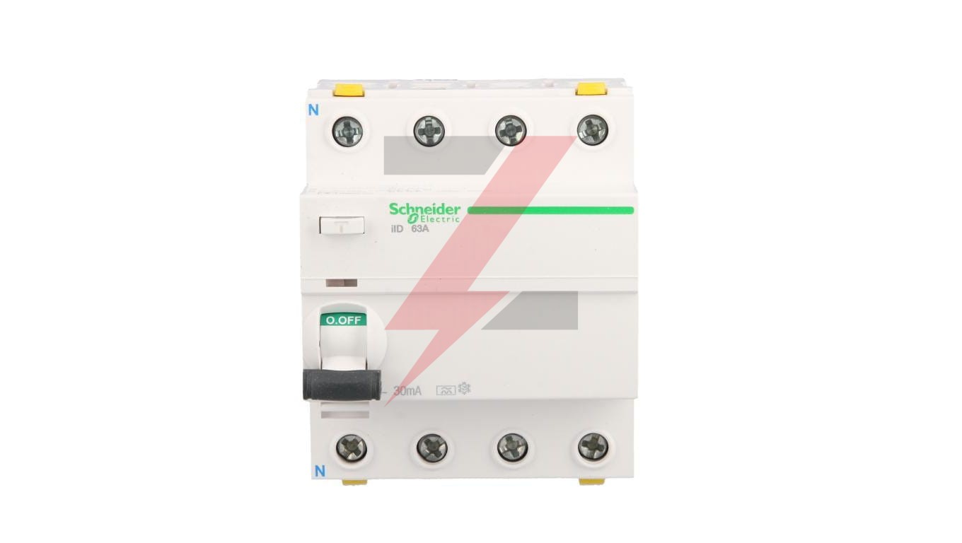 Wyłącznik różnicowoprądowy iID-63-4-30-A 63A 4-biegunowy 30mA typ A ,o numerze A9Z21463 Podwójne zaciski - możliwość bezpośredniego podłączenia dwóch przewodów o różnych przekrojach. Optyczny wskaźnik Visi-Trip wyzwolenia elektrycznego, biało-czerwony. Możliwość demontażu pojedynczego aparatu bez potrzeby zdejmowania szyny łączeniowej. Zdjemowanie z szyny DIN bez użycia narzędzi. Możliwość sprawdzania poprawności działania przyciskiem kontrolnym T jedynie raz do roku, przez pierwsze 7 lat użytkowania. Tor N umieszony po lewej stronie, ułatwia oszynowanie z wyłącznikami nadprądowymi.