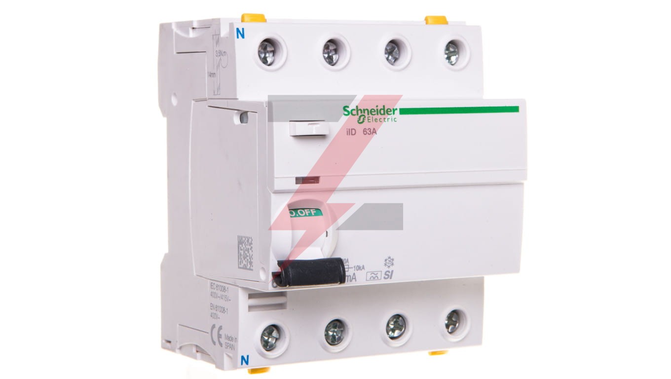 Wyłącznik różnicowoprądowy iID-63-4-30-Si 63A 4-biegunowy 30mA typ Si ,o numerze A9Z31463 Podwójne zaciski - możliwość bezpośredniego podłączenia dwóch przewodów o różnych przekrojach. Optyczny wskaźnik Visi-Trip wyzwolenia elektrycznego, biało-czerwony. Możliwość demontażu pojedynczego aparatu bez potrzeby zdejmowania szyny łączeniowej. Zdjemowanie z szyny DIN bez użycia narzędzi. Możliwość sprawdzania poprawności działania przyciskiem kontrolnym T jedynie raz do roku, przez pierwsze 7 lat użytkowania. Tor N umieszony po lewej stronie, ułatwia oszynowanie z wyłącznikami nadprądowymi.