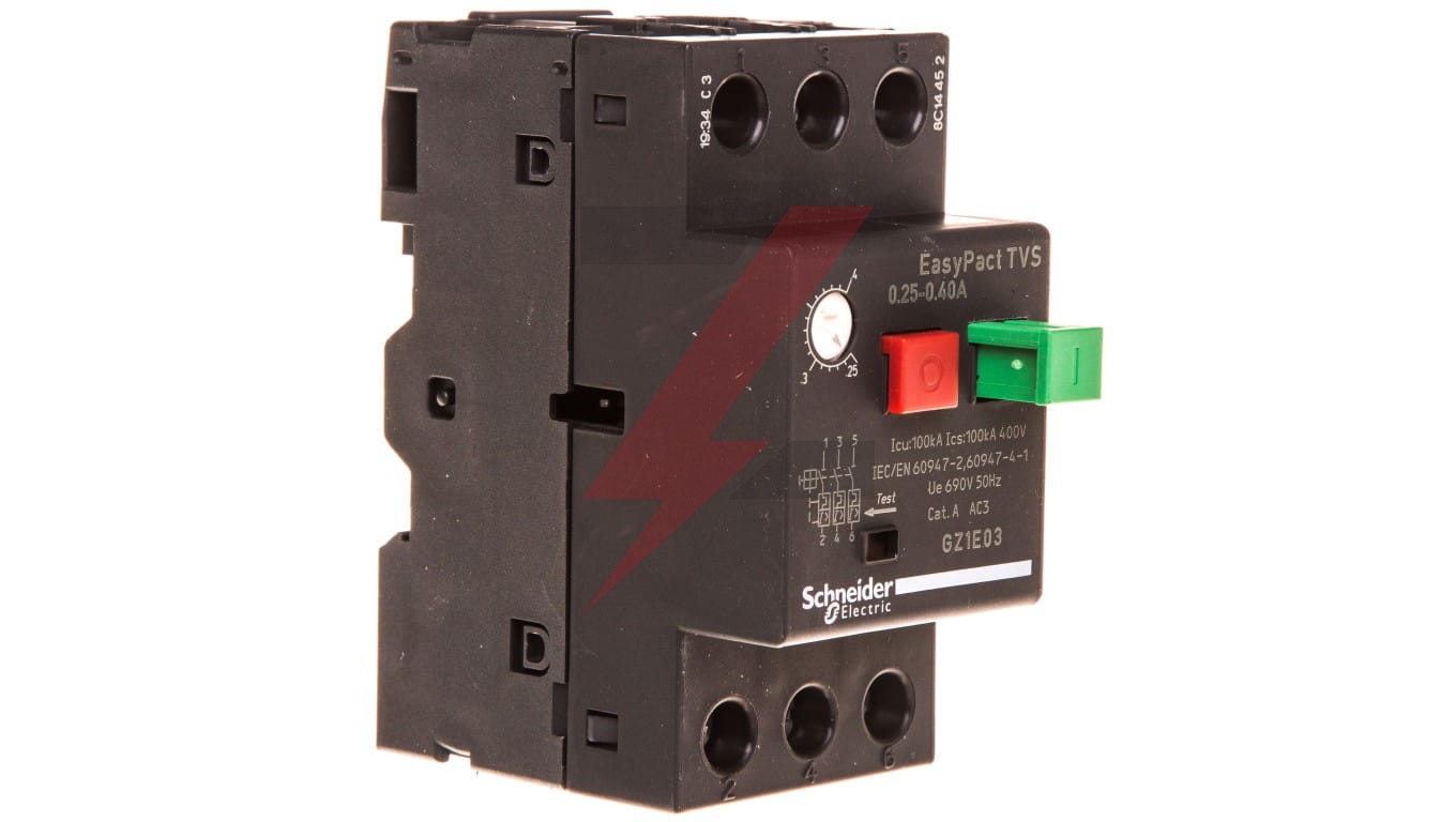 GZ1E03 jest wyłącznikiem silnikowym z serii EasyPact TVS firmy Schneider Electric. Zapewnia zabezpieczenie zwarciowe i przeciążeniowe. Umo żliwia sterowanie silnikiem (załączanie/wyłączanie) za pomocą przycisków. • Zakres nastaw zabezpieczenia termicznego [A]: 0,25 – 0,4 • Kategoria użytkowania zgodnie z IEC 60947-4-1: AC-3 • Liczba biegunów: 3